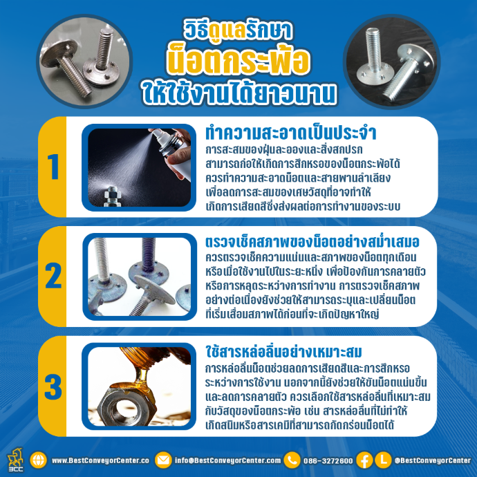 การดูแลรักษาน็อตกระพ้อเป็นสิ่งสำคัญเพื่อให้ระบบสายพานลำเลียงทำงานได้อย่างราบรื่นและยืดอายุการใช้งานของน็อต