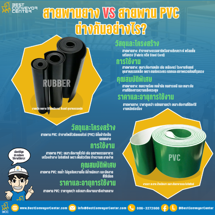 การเลือกสายพานลำเลียงที่เหมาะสมเป็นสิ่งสำคัญต่อประสิทธิภาพการทำงาน วันนี้เราจะมาเปรียบเทียบ  สายพานยาง  และ  สายพาน PVC  เพื่อช่วยให้คุณเลือกใช้ได้อย่างเหมาะสม