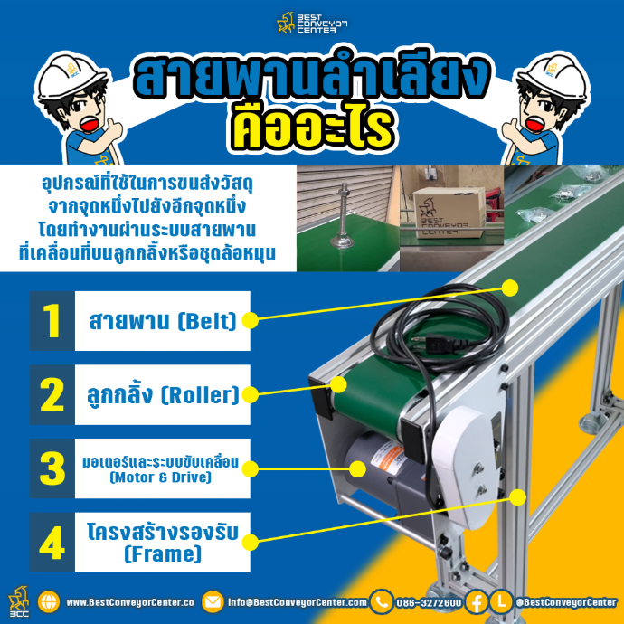 อุปกรณ์ที่ใช้ในการขนส่งวัสดุจากจุดหนึ่งไปยังอีกจุดหนึ่งอย่างมีประสิทธิภาพ โดยทำงานผ่านระบบสายพานที่เคลื่อนที่บนลูกกลิ้งหรือชุดล้อหมุน