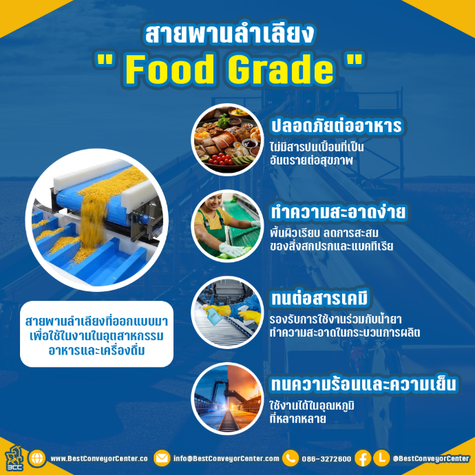 สายพานลำเลียงแบบ Food Grade คือสายพานลำเลียงที่ออกแบบมาเพื่อตอบโจทย์การใช้งานในอุตสาหกรรมอาหารและเครื่องดื่มโดยเฉพาะ