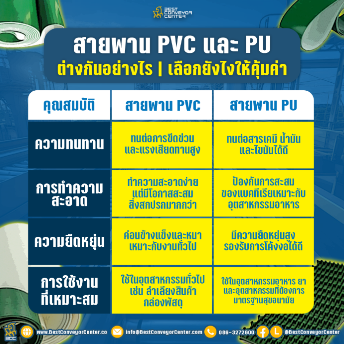 สายพาน PVC และ PU ซึ่งแต่ละประเภทมีคุณสมบัติและการใช้งานที่แตกต่างกัน การเลือกใช้ให้เหมาะสมกับธุรกิจจะช่วยเพิ่มประสิทธิภาพและลดต้นทุน