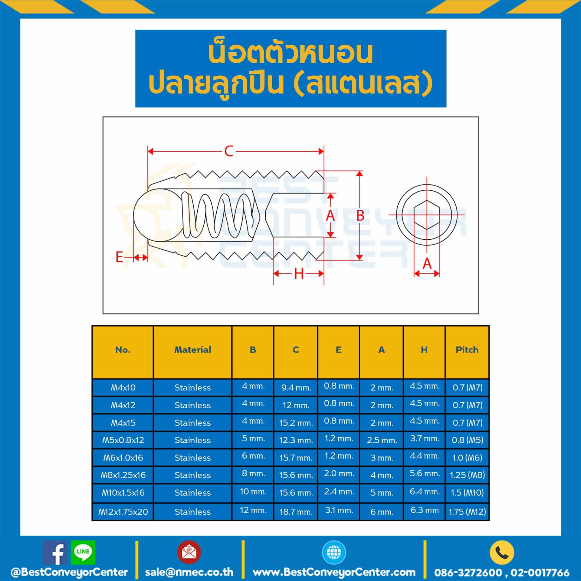 M8L16SSP สกรูตัวหนอน M8x1.25x16 ปลายลูกปืน (Stainless Steel)