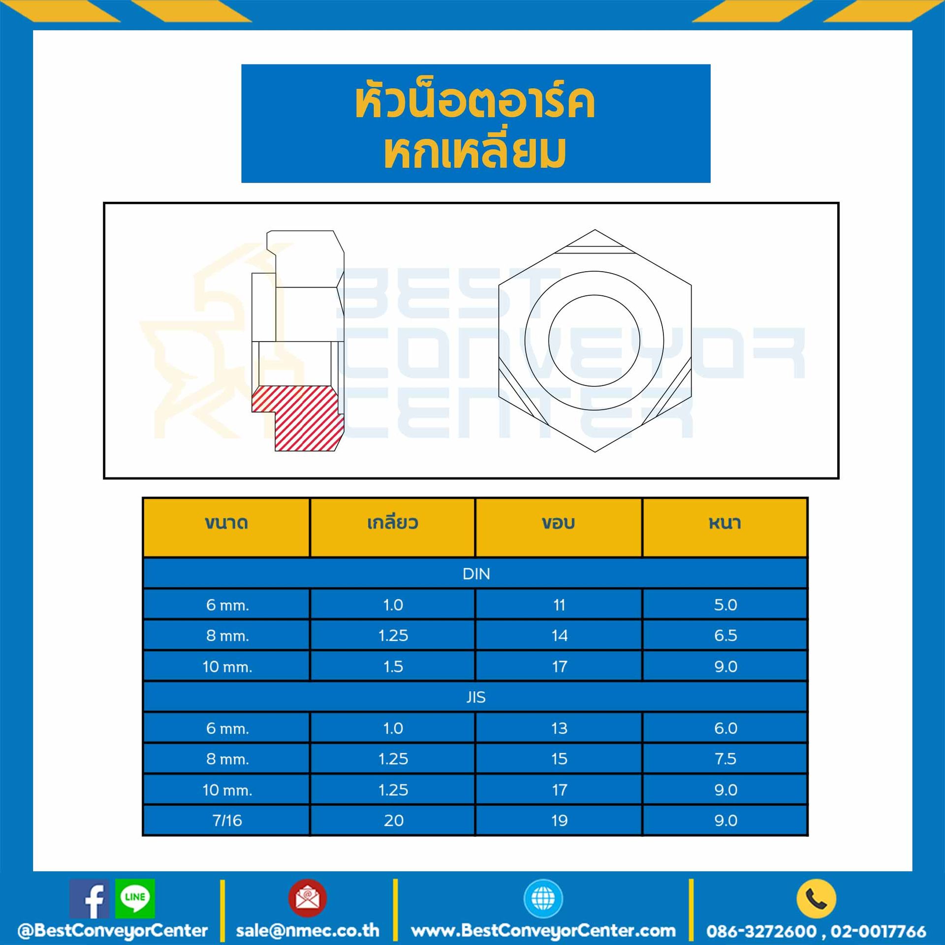 WN-DIN-M8 : หัวน็อตอาร์คหกเหลี่ยม DIN ขนาด M8x1.25 ขอบ 14 หนา 6.5 mm